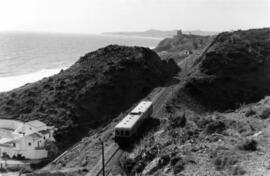 Automotor bordeando la costa del Sol entre Málaga y Fuengirola. Trincheras para salvar los pequeños promontorios.