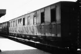 Coche de viajeros CC 159 de la serie CC 151 a 160 de RENFE, dotado de estribo lateral y ex Andaluces serie CC xffv 11 a 20, fabricada por La Brugeoise y Nicaise et Delcuve en 1924, formando parte de una composición detenida en los andenes de Cercanías de la estación de Madrid - Atocha