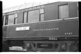 Coche restaurante WR 2747 de la Compañía Wagons Lits, circulando por los alrededores de Madrid mientras forma parte de la composición especial de viajeros con motivo del 25º aniversario de la Asociación de Amigos del Ferrocarril (AAF), remolcada por la locomotora de vapor 141 F - 2332 (serie 141F -2301 a 2417 de RENFE)