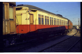Vista lateral del coche sanitario SS-301 del Servicio Asistencial y de Medicina Preventiva de RENFE, dispensario móvil nº 2 denominado Virgen de la Almudena. Construido a partir de un antiguo coche Costa de MZA numerado CW-ffv-266, y transformado por Renfe en 1940 en los talleres de Cerro Negro en Madrid, pintado de rojo y blanco.
