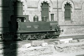 Composición de mercancías circulando por Barcelona, remolcada por la locomotora de vapor 120 - 0224 de RENFE, ex Bilbao a Portugalete nº 11, denominada Cantalojas y fabricada por Nasmyth Wilson en 1893 con nº de fábrica 444