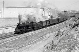 Composición de viajeros, remolcada por locomotora de vapor de la serie 230 - 2065 a 2074 de RENFE (ex MCP nº 701 a 706, ex Medina del Campo a Salamanca nº 51 a 54, y ex Oeste nº 701 a 710), fabricada por Linke - Hoffman y Babcock & Wilcox entre 1922 y 1928, circulando por la línea de Contorno o Circunvalación, en las proximidades de la estación de Madrid - Delicias