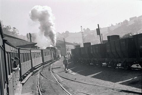 Composiciones de viajeros y de mercancías del Ferrocarril de Langreo, remolcadas por locomotoras de vapor, en la estación de San Pedro (Siero)