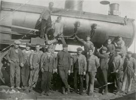 Vista del personal ferroviario en el depósito de máquinas en la estación de Madrid - Delicias posando junto a una locomotora de vapor 507 propiedad de la extinta Compañia de los Ferrocarriles de Madrid a Cáceres y Portugal. El remitente de la foto se trata de Pedro Molina Santaella.