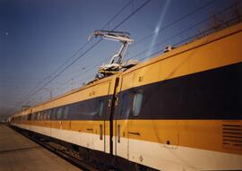 Vista del lateral del electrotrén basculante o automotor eléctrico 443 - 001, conocido como "Platanito" estacionado en las vías de una estación sin idenfificar en la que se puede observar también el pantógrafo de dicho tren.