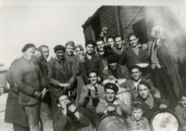 Vista general de los treinta y cinco agentes en la estación de Alcoy que fue remitida por Antonio García Más además de que es posible observar a dos agentes sujetando unas paelleras.