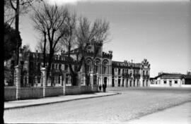 Vista general del edificio de viajeros de la estación de Aranjuez, tomada por el lado de la población, y tapada parcialmente por una verja y árboles. En la calle, caminando hacia la cámara, hay un hombre y un niño, seguramente viajeros que han salido de la estación.