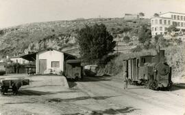 Vista general de una estación sin identificar entre la línea de vía estrecha entre las localidades de San Feliu de Guixols y Girona en la que se puede observar al lado de una locomotora de vapor abandonada a lo que parece un miembro de la estación; también se pueden observar estacionados en las vías tanto vagones abiertos como cerrados.