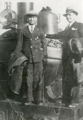 Vista en primer plano del jefe de maquinistas en Madrid - Fuencarral, don Ildefonso Barrera García posando junto a su padre José Barrera Toscada junto a una locomotora 1478 propiedad de la Compañía del Norte.