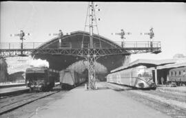 Vista de la salida de la estación con el puente de señales, se observan varias composiciones, el automotor térmico diésel TAF de la serie 595 de RENFE y varios coches de viajeros. A la derecha carretilla portaequipajes.
