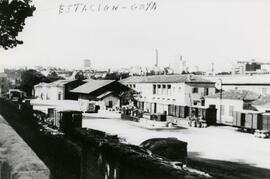 Vista desde otra perspectiva de la antigua estación de Madrid - Goya en la que se puede observar en la parte inferior de la imagen, una composición de vagones cerrados, además también se puede localizar un camión y por último se puede ver lo que podría parecer el edificio de viajeros de la estación.