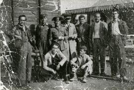 Vista general de nueve amigos en la estación de San Roque en la que aparecen de izquierda a derecha Juan García Utrera, Manuel Villanueva, un Guardia Civil sin identificar, Cristóbal Rubio Jaén (fue factor en Madrid), Antonio Riva, José Auche Carrasco y Juan Expósito Avilés, propietario de la fotografía, y en la parte inferior de la imagen, se localizan en primer plano, el hijo de un factor de circulación llamado Miguel Santo y otra persona sin identificar.