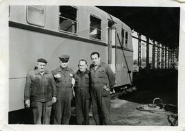 Vista general del interior de la estación de Valencia - Término o conocida en la actualidad como Valencia - Norte, en la que posan junto a un viejo automotor el equipo de la estación para llevar a cabo su limpieza apareciendo retratados José Cenón, José Castillo, Cristóbal Gómez y el dueño del documento, José María Fuentes.