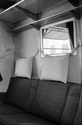 Interior de un coche de viajeros de 1ª clase AA tipo serie 5000 de RENFE, que forma parte de una composición realizada para visitar los enlaces ferroviarios de Madrid, con motivo del XVII Congreso Internacional de Ferrocarriles