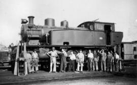 Vista general de la locomotora de vapor tipo tanque del Ferrocarril Madrid-Almorox, para vía estrecha, en la que se puede observar también a personal ferroviario.