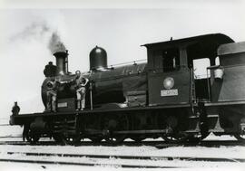 Vista general de la locomotora, sobre la que posan el fogonero José Pérez Martín, posteriormente, maquinista de tracción diésel, y el maquinista Rafael Pérez Pérez. Se aprecia la placa de fabricante redondeada de Great Southern of Spain Railway, y un cubo colgando del ténder.