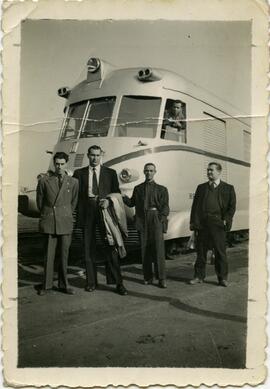 Vista general de un TAF incorporada al servicio estacionada en el depósito de automotores de Cerro Negro. En la fotografía aparecen en la cabina el que era el ayudante de maquinista, Gonzalo Fernández y de derecha a izquierda, se encuentran Pedro Recarte, Francisco Santos, Faustino Tuchi y el señor Corcuera.