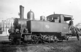 Locomotora nº 28 de los Ferrocarriles Suburbanos de Málaga, Construida por Tubize en 1906. Es de tipo 030. Dentro de la cabina está el maquinista y a su lado, otra persona.