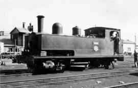 Vista general de la locomotora de vapor nº 204 "Canet", construida por North British en 1910 con nº de fábrica 19018, para vía estrecha, en la estación de Sagunto. Se observa al maquinista y otros trabajadores.