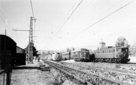 Locomotora Talgo II "Virgen de Begoña", junto a ella una eléctrica 7404 (serie 274) y una diésel, en un lugar sin identificar
