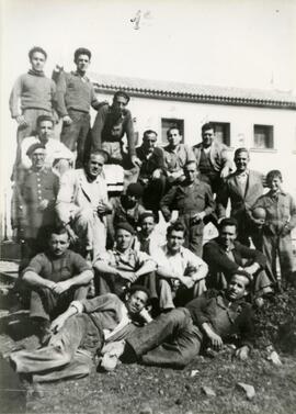 Vista general del personal encargado del montaje de la subestación de Peñalajo que estaba integrada en la electrificación de Álcazar a Córdoba. El remitente de la fotografía es Rafael Cruz Latorre siendo el primero a la izquierda entre los agentes que aparecen sentados. A su lado, sentado también está Lorente Moreno y Briz Martínez. Ya de pie, el primero a la derecha está el señor Marcuello, a su izquierda está el señor Ledro Sánchez, a su izquierda, el señor Barinaga Oñate y más a la izquierda el señor Serrana.