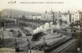 Vista de la Estación de Barcelona, mientras un tren de mercancías remolcado por una locomotora de vapor, está efectuando su salida del muelle. En el Paseo de Colón se ven varios coches de caballos circulando.