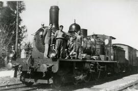 Vista general a parte del personal del depósito de máquinas en Utrera subido a la locomotora de vapor 230 - 4121 de Renfe, de la serie 230 - 4111 a 4143, ex Andaluces, serie 311 - 312 fabricada por Babcock & Wilcox en 1929 con número de fabrica 298 y 299. Además, en la imagen se puede ver: al maquinista ya jubilado en Sevilla, José Rondán Ríos, a José Ojeda García, maquinista de tracción eléctrica en Sevilla, y por último, a José Morales García, maquinista de tracción diésel en Huelva.