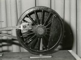 Vista frontal de una rueda de locomotora que parece encontrarse encontrarse expuesta en lo que podría ser una sala de exposiciones