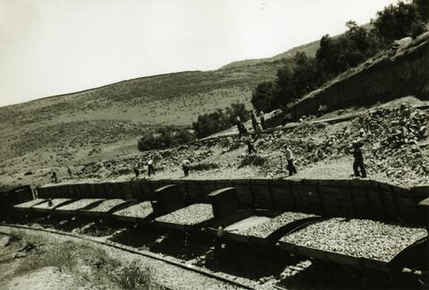 Vista de una cantera de balasto en el km. 61,000 de la línea de Zafra a Huelva, en primer plano vagones cargados con el balasto extraído de la cantera y vista parcial de una locomotora de vapor no identificable, en segundo plano varios miembros del personal de vía y obras extraen y colocan la piedra para su carga en los vagones.