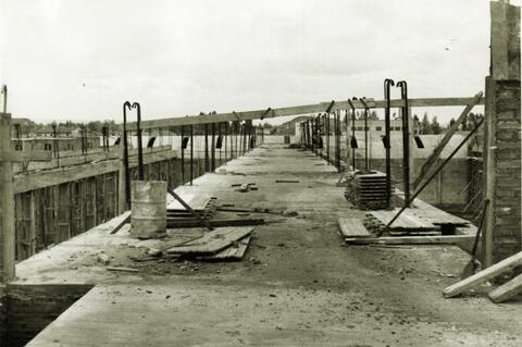 Vista de la azotea entre naves, al fondo bóveda de la nave de reparación diaria del depósito de Tracción eléctrica de la estación de León de la línea de Palencia a La Coruña