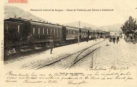Ferrocarril Central de Aragón. Tren de viajeros estacionado en la estación de la Línea de Valencia , por Teruel, a Calatayud. Podemos ver a varias personas en el andén y dentro de los coches.